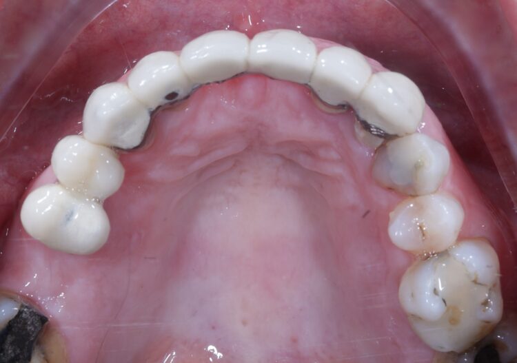 A 61-year-old female patient presented with a failing, upper 3-3, metal ceramic bridge, connected to the canines and lateral incisors on either side. The bridge had failed with caries and core fractures on both abutment teeth on the patient’s left side. As such, the patient was keen to repair or replace the bridge without the use of a removable prosthesis at any point during treatment.