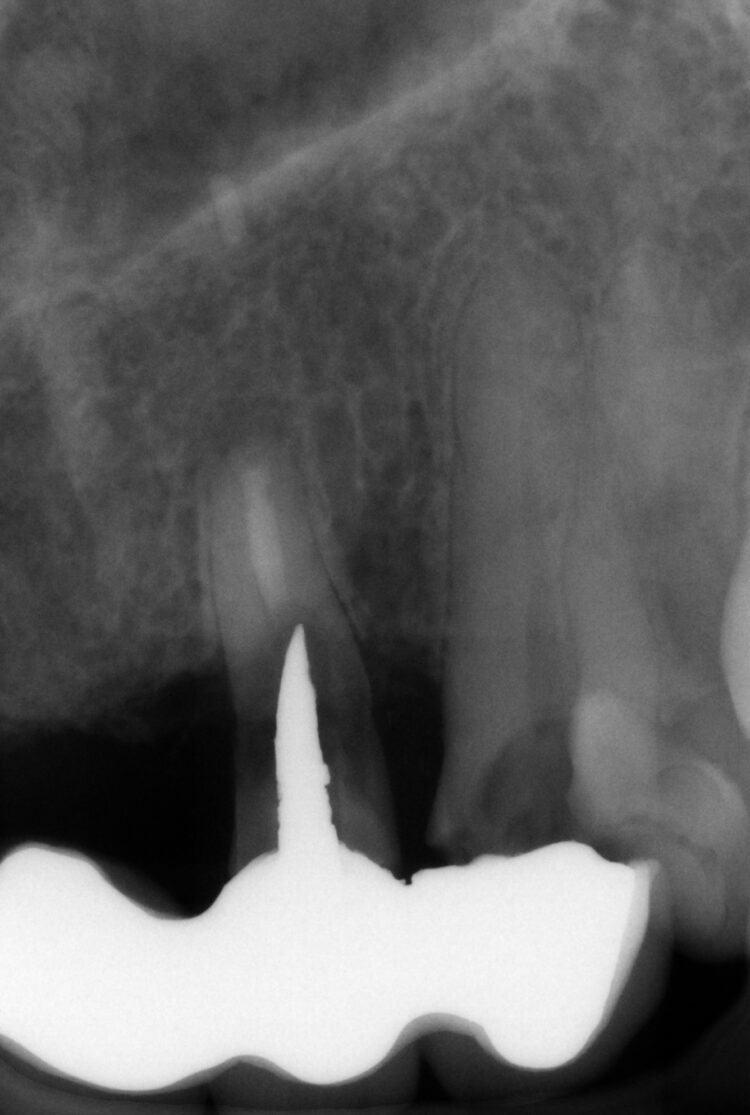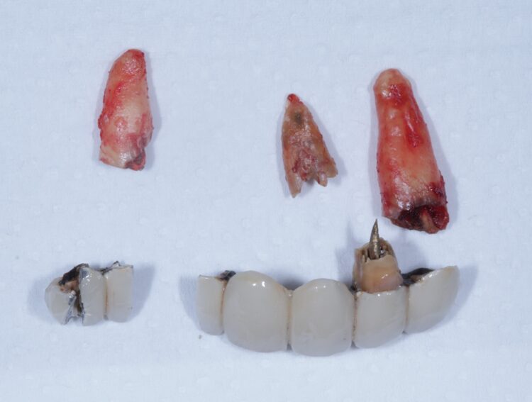 Despite using all the available examination tools, it was still challenging to assess the level of damage to the teeth under the metal ceramic bridge, because the prosthetic material obstructed the x-ray. It was confirmed that two teeth were decayed and fractured, but it was not possible to confidently diagnose the UR2.