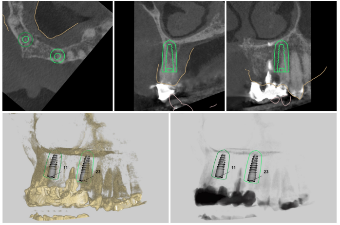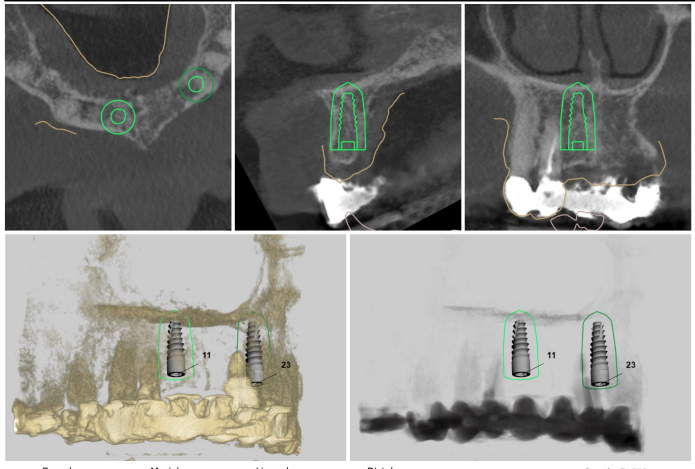 For the second implant, both central incisor sites would have been suitable, but the UR1 location was selected as an ideal position to support a 4-unit bridge. Questions remained over the UR2, so preparations were made for different situations. If the tooth was found to have a poor prognosis upon assessment, we would be able to create a cantilever on the bridge to the UR3. Digital tools were used to plan treatment, including the precise implant positions, angulations and depths.
