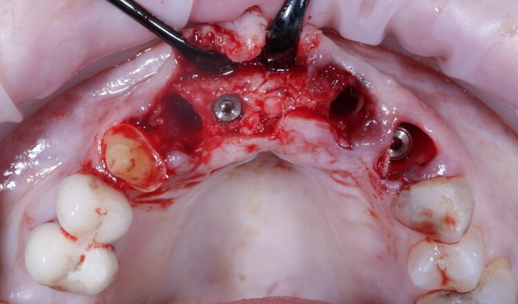 Bone grafting was then performed, placing MinerOss X (BioHorizons Camlog) into the extraction sockets and the jump gap around the implant in the UL3 socket, to preserve the existing bone of the socket. This would help to minimise changes in the bone post-surgery and help to maintain the buccal profile of the ridge. The biomaterial is a bovine bone mineral matrix that has been proven to increase vertical bone height alongside implant placement.[vi] It has worked very well in my cases to date, offering a high turnover to bone for maximum stability and efficient results with immediate implant protocols.