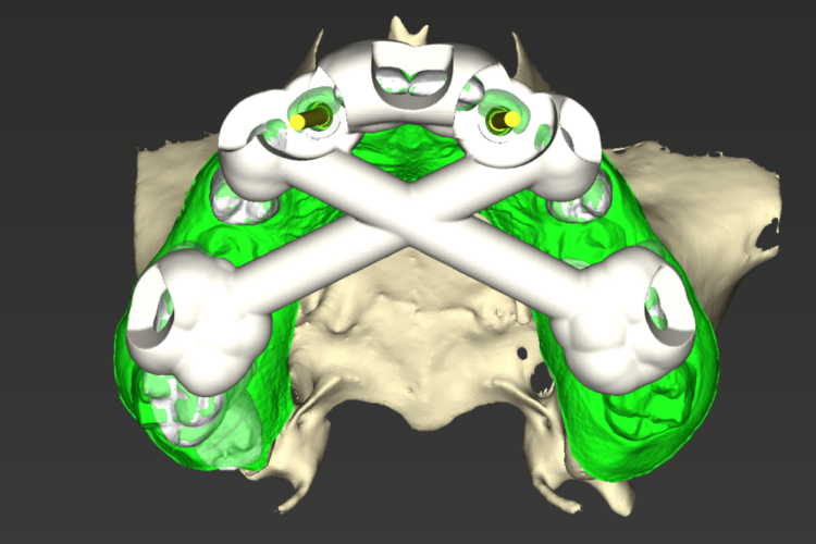 The implant surgery was performed in May 2023 and was filmed live as part of a surgical demonstration for the delegates on a guided surgery course being run by the Fitz Fahey Academy. Implants were placed in the UR2 and UL2 spaces with simultaneous hard and soft tissue grafting. Following the surgery, the patient was provided temporary teeth and instructed to avoid putting undue pressure on the implants during healing.