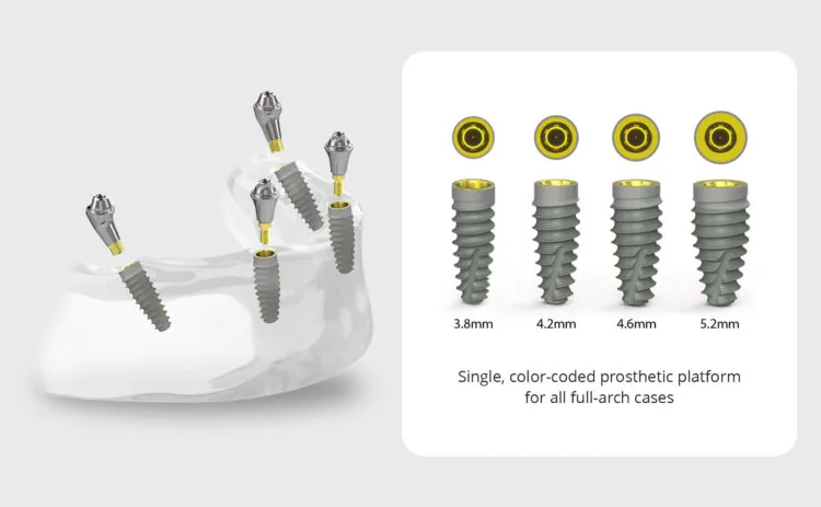 Now you can perform a full-arch case with a single prosthetic platform, which means that each abutment is interchangeable across all implant sites.